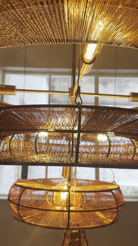 De un breve escape del ejercicio arquitectónico nace la nueva colección de lámparas tejidas en cobre, estaño y fique. La superposición de diferentes figuras geométricas básicas dio forma a los diferentes diseños, esta colección de luminarias, disponibles en varios formatos diferentes.